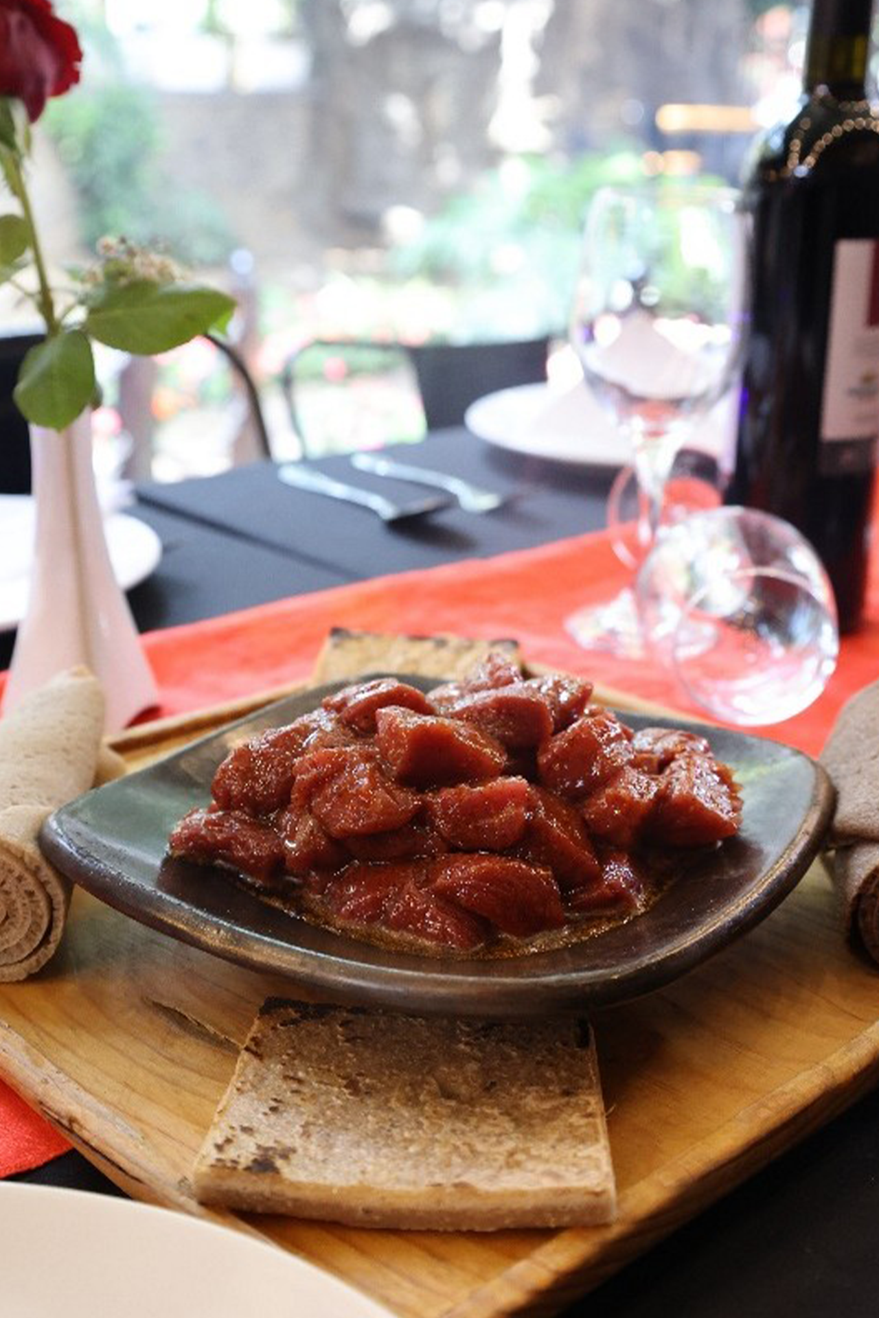 Features a contemporary menu focused around traditional Ethiopian cuisine including specialty dishes like raw meat, gored gored, kitfo, and BBQ complemented by our own section of wine, tej, and other craft cocktails, as well as a variety of unique entrees that satisfy every palate.